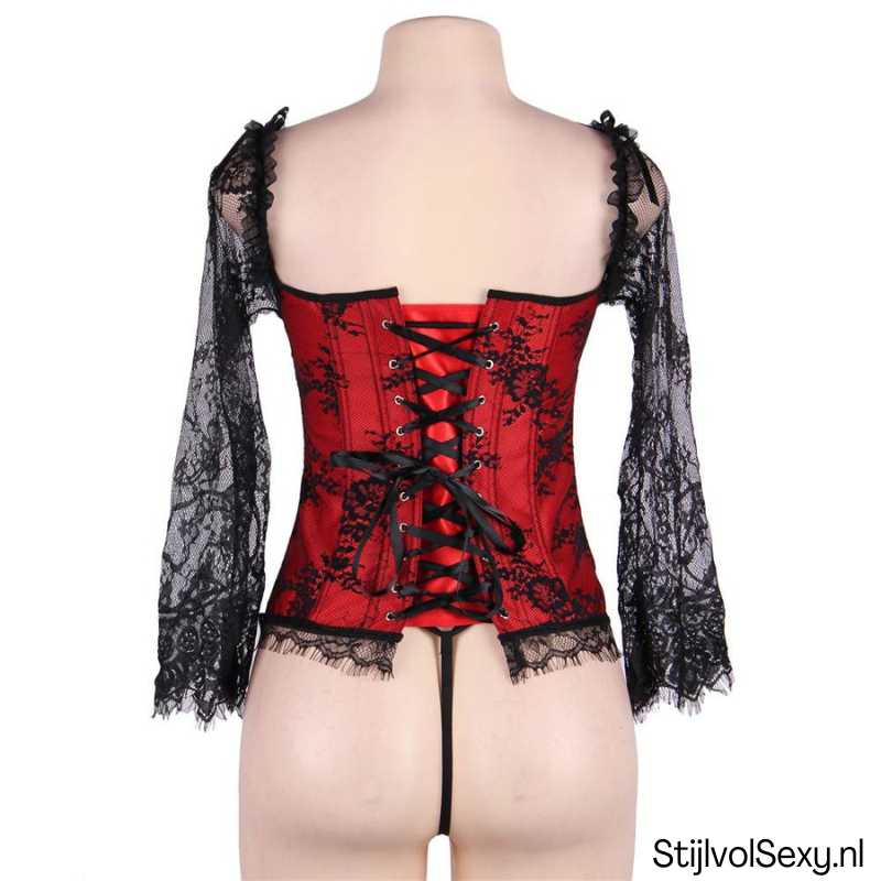 Isabella is een schitterend sexy Burlesque Korset met zwarte kanten mouwen en baleinen. De rode stof heeft een stijlvol patroon en is van een hoge kwaliteit. Het korset heeft aan de voorzijde een metalen haaksluiting en aan de achterzijde een vetersluiting met een mooi zwart satijnen lint. Met de vetersluiting is het korset op maat in te rijgen, zodat het korset passend om je lichaam sluit en je een prettig draagcomfort hebt. De lange mouwen zijn gemaakt van sierlijk doorzichtig kant en zowel On the shoulder als Off the shoulder te dragen. De onderzijde van het korset is rondom afgezet met een mooie kanten rand. Bij het korset wordt ook een string geleverd in dezelfde kleur stof als het korset. Burlesque Korset Isabella maakt jou verleidelijk en onweerstaanbaar!