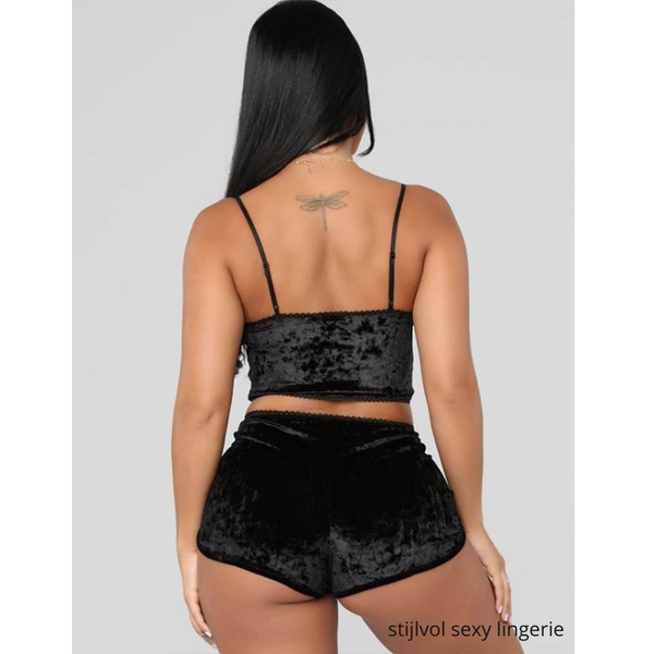 Dit sexy setje is gemaakt van de zachte stof velours in de kleur zwart en bestaat uit een mouwloze top en een short met elastiek in de tailleband. De schouderbandjes van de top zijn verstelbaar, zodat je een altijd goed draagcomfort hebt. Voel je super sexy en vrouwelijk met dit heerlijk zachte setje!