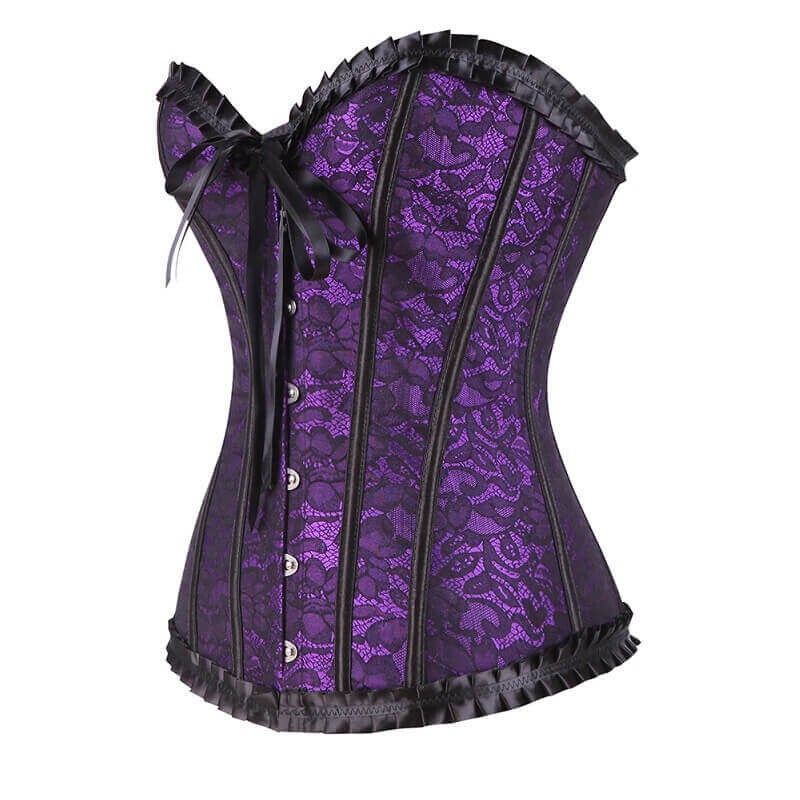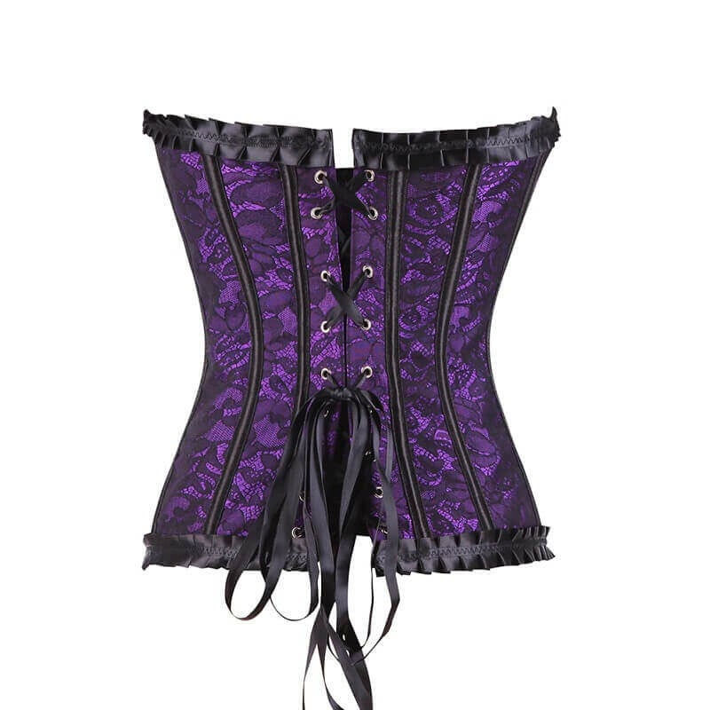 Dit prachtige paarse korset is een stijlvol kanten korset met 10 baleinen die je vrouwelijke rondingen goed laten uitkomen. Aan de voorzijde is dit korset voorzien van een metalen haaksluiting met een satijn gestrikt lint in het midden van de borsten. Op de rugzijde zit een mooie vetersluiting met een zwart satijnen lint waarmee je het korset goed op maat kan inrijgen. De stof is van een hoge kwaliteit en is met het zwarte bloem motief schitterend en stijlvol om te zien. Alle randen van het korset zijn prachtig afgewerkt met mooi geplooid zwart satijn. Dit mooie korset is niet alleen te dragen op romantische avonden, maar staat ook heel leuk op een broek of rok tijdens een feestje of in een club. Een ding is zeker, je krijgt alle ogen op je gericht, want je straalt één brok verleiding uit!