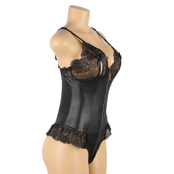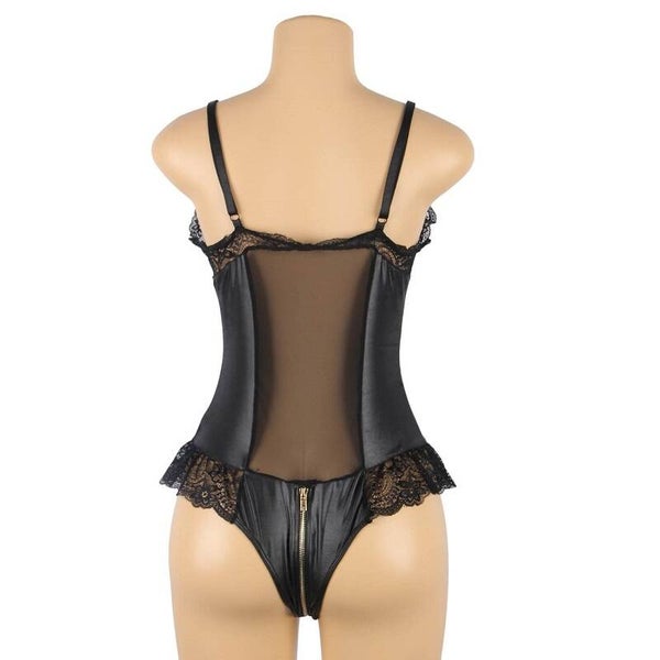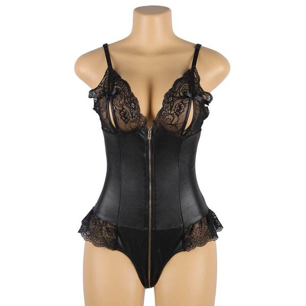 Deze ondeugende faux lederen body heeft in de beha doorschijnende kanten openingen bij de tepels met satijnen strikjes. Door de strikjes wat meer open te strikken worden je tepels uitdagend zichtbaar. Het lijfje van de body is van imitatieleer, waarin aan de voorzijde een goudkleurige rits is aangebracht die via het kruis doorloopt tot net boven de billen. Deze rits is van twee kanten te openen, waardoor een open kruis kan worden gemaakt. De spaghettibandjes over de schouders zijn verstelbaar. Hierdoor zit de body altijd comfortabel voor jouw lichaam. De zijkanten van de body zijn afgewerkt met gegolfde zwart kant en de achterzijde is verleidelijk uitgesneden. Elke vrouw wil deze zwarte clubwear body in haar lingerie la hebben voor de spannende nachten.