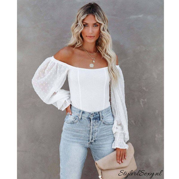 Witte stretch off the shoulder body met wijde doorzichtige mouwen