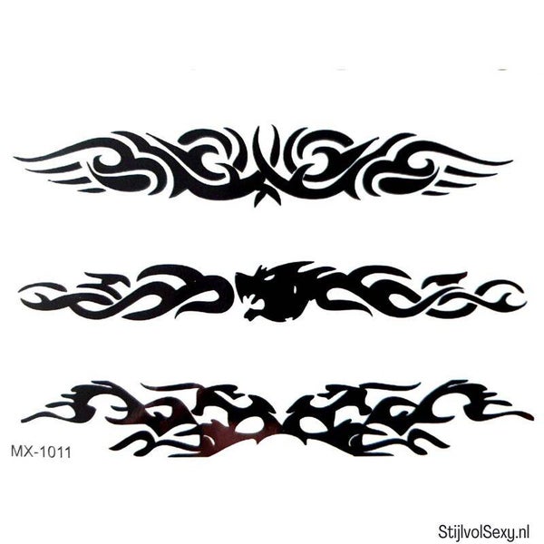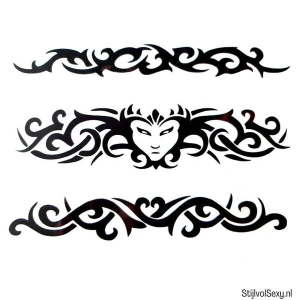 - 5 tribal tatoeages van 13,5 cm lang en tussen de 2 en 3,5 cm hoog.